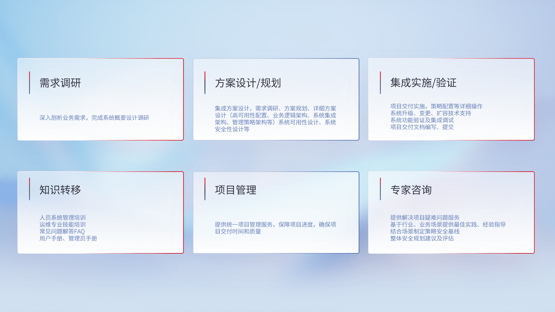 针对客户行业特性,,将宏观的安全战略和需求,,通过专业的交付服务,,,实现项目落地,,为客户提供标准规范的集成交付服务。。。。